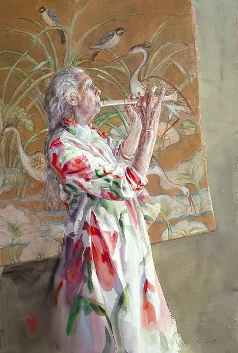 "Coming to Camelot, is of my neighbor, Dot, who is skipping past ninety-five years old. Inspired by her expressive hands and white hair, the painting is a nod to the pageantry and spirit of aging. Does Dot actually play the flute? No, but she sure has the playful quality of music.” Mary Whyte